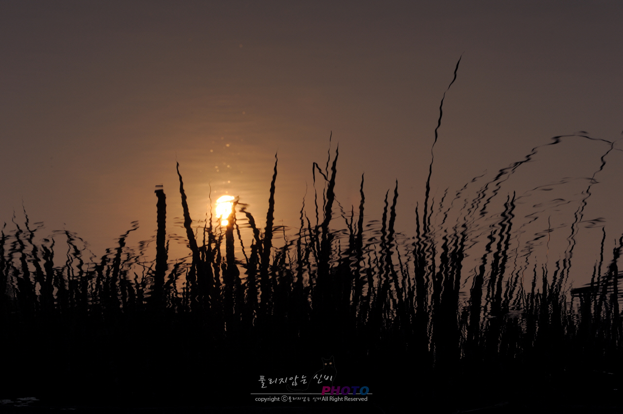 해질녁 물에 반영된 수풀과 해를 찍었다. 마치 보름달을 보는듯한 묘한 분위기가 연출되었다.