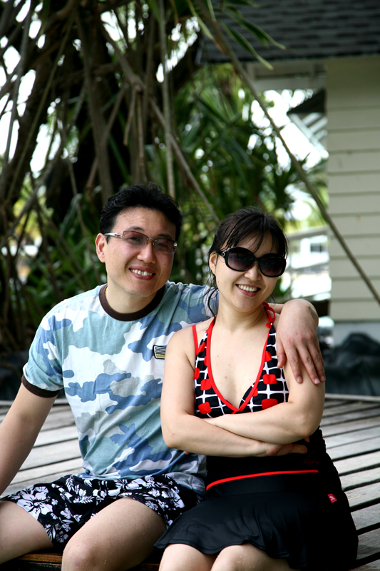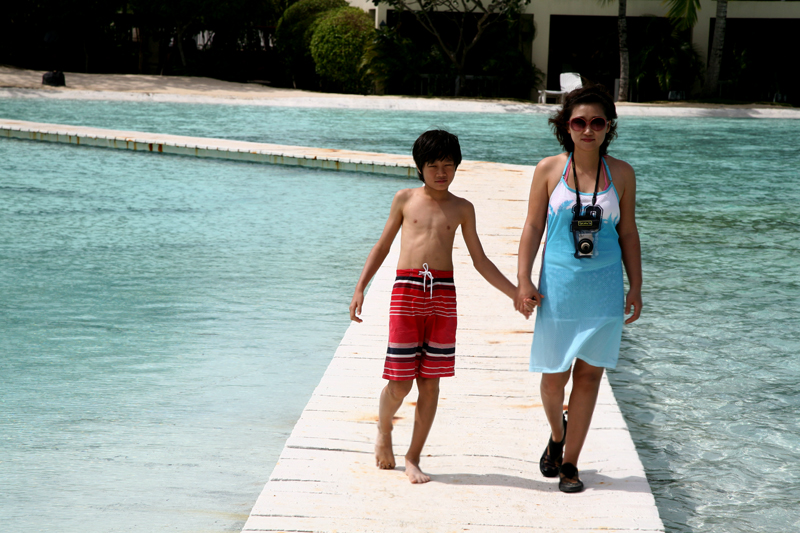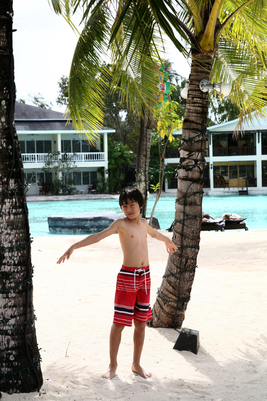 우린 어제 밤에 헤어질 때 7시30분에 숙소 앞에서 만나 같이 식사하러 가기로 했다. 아침에 모두 모여 식당으로 이동하였다. 식당은 킬리만자로 카페이고 뷔페식이었다. 식당 주변부에 킬리만자로 민물 수영장으로 둘러 싸여 있는 멋진 식당이었다. 그러나 음식의 종류나 맛은 그다지 훌륭하지 않았다. 내가 여행 중 호텔에서 먹어본 조식뷔페중 제일 별로였던 것 같다. 암튼 아침식사를 마치고 리조트를 산책하기로 했다. 참 다양한 놀거리가 준비되어 있다. 거의 대부분이 무료이고 일부 유료인 것도 있다. 윤상이가 암벽타기를 할 수 있는 곳이 있어 암벽을 타고 올라간다. 윤상이가 어름 포함해서 가장 높이 올라갔다. 윤상이의 기세가 등등하다. 퍼팅을 할 수 있는 미니 골프장도 있고, 양궁장, 테니스장도 있다. 산책을 마치고 숙소로 돌아와 수영복으로 갈아입고 숙소 앞에 있는 오리온 비치로 갔다. 오전이라 그런지 물속에서 놀기 좀 쌀쌀하다. 바람도 좀 불고 아이들은 잠깐 물속에 들어갔다가 금방 나온다. 좀 따뜻해지길 기다리며 사진을 찍었다. 마치 화보촬영의 모델이라도 된 것처럼 이국적인 풍경에 부부들은 연신 카메라 셔터를 눌러댓다. 우린 다른 풀장으로 이동을 했다. 처음에 갔던 곳은 어린이 해수풀장으로 바닷물을 받아서 만들 수영장이고 다음으로 간 곳은 민물 수영장이다. 조그마한 미끄럼틀이 있다. 아이들은 미끄럼틀을 타기도 하고 물속으로 뛰어 들어가기도 하며 놀았지만 역시 오래가지 않았다. 춥기 때문이다.
