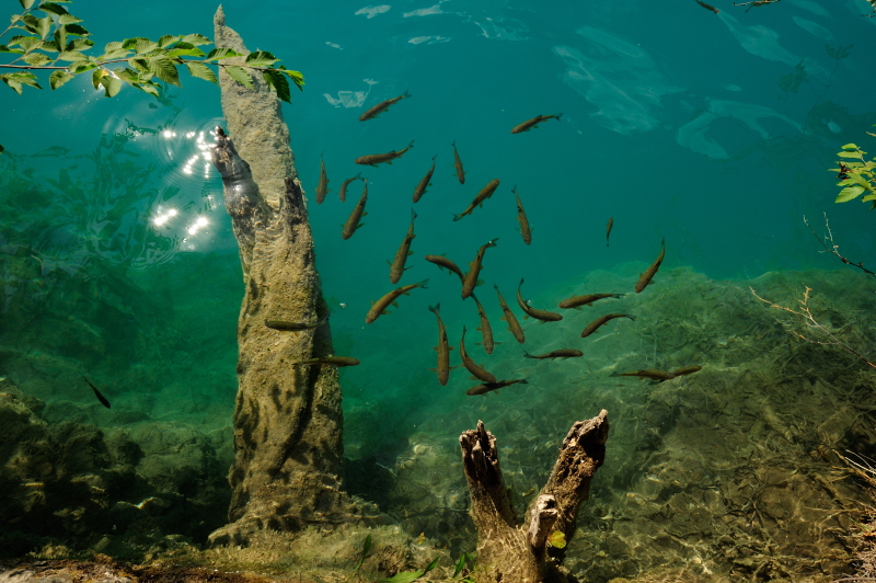 호수에 송어가 떼를 지어 돌아다니는 게 선명하게 보인다.