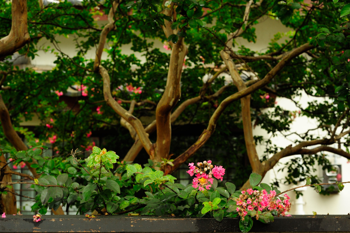 담장 밖에 있는 꽃이 담장 안에 있는 꽃에게 말을 거는 것 같다. 밥 먹었어?