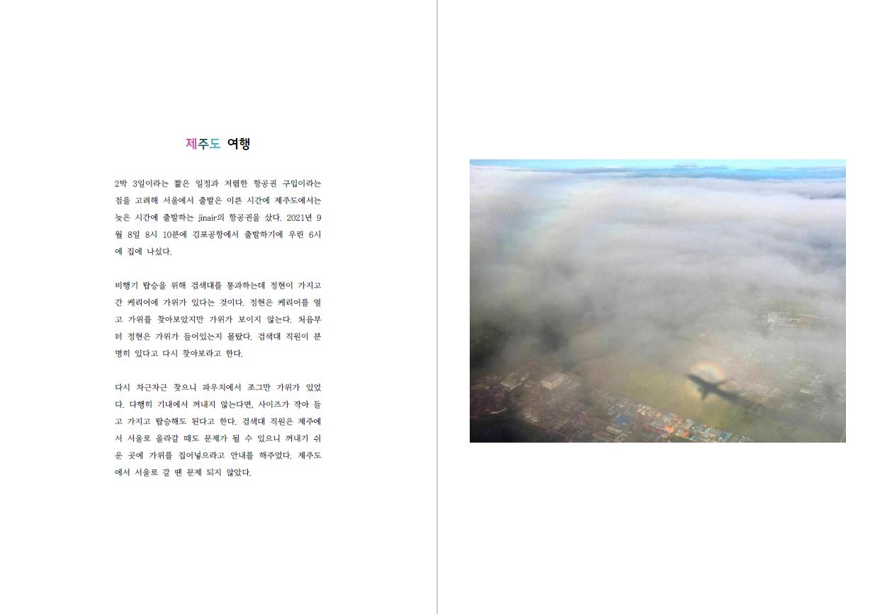중국에 있는 처형이 한국에 방문했다. 원래 얼마전 중국으로 다시 들어가야 했는데 코로나19 백신관련 문제가 있어 출국이 늦어져 함께 제주도 여행을 할 수 있었다. 제주도 여행 기념이 될 수 있도록 작은 여행 책자를 만들었다. 다들 기뻐한다.